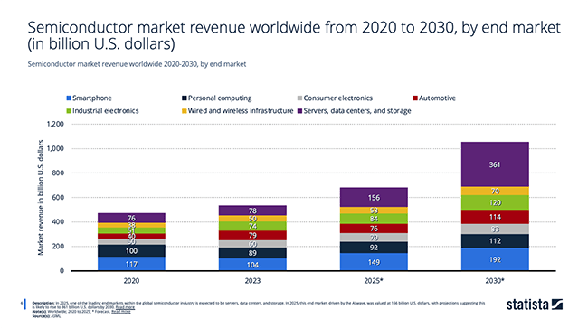 • AI is the Primary Catalyst for Demand: The Servers, Data Centers, and Storage end market, driven by the AI wave, is the fastest-growing sector. It is projected to more than double from $156 billion in 2025 to $361 billion by 2030.