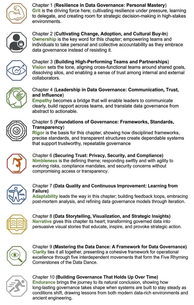 Here’s the choreography of the journey through this book; each step aligned with the ten-letter arc of the GOVERNANCE Dance Framework.